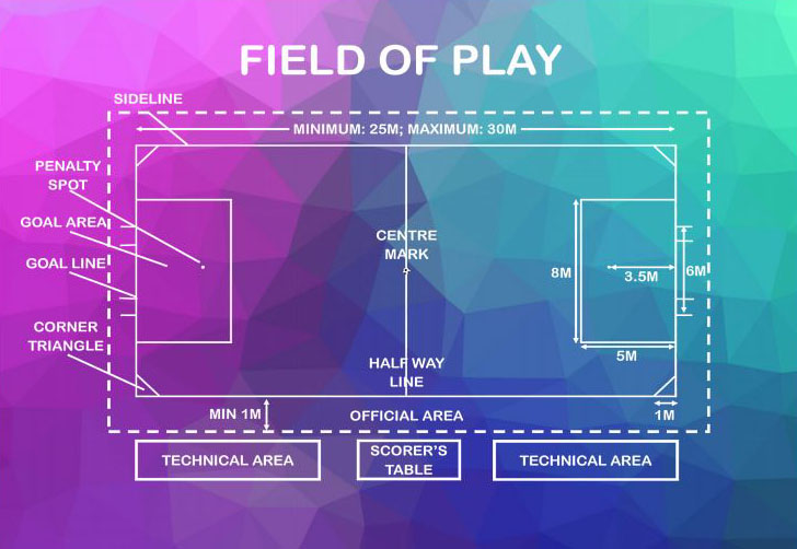 A goal area is marked at the centre of each end of the field, 8 m (26 ft) wide and 5 m (16.5 ft) deep.